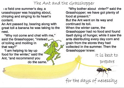 Here is another new one on me! I never would have thought of Aesopic refrigerator magnets. These two are very nicely made. Notice the hyperbole in the GA text: the ant drags a banana to his nest! Space and a change of typeface set off the moral in each case. Now here is a use of fables that Aesop never had in mind!