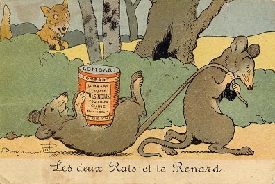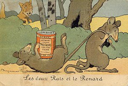 1905? Benjamin Rabier, "Le deux Rats et le Renard." Chocolate Lombart, Paris. $35 at Foster City, Feb., '97.