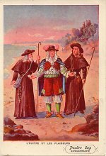 "L'Huitre et les Plaideurs, " Le Laboureur et ses Enfants, "; MM, and WL. These are large cards! The approach to each scene comes from traditional sources, like Dor é for the oyster scene on the beach and the river scene between wolf and lamb. Notice that the wolf's neck here is so elongated that he may look more like a horse! The scene of the old worker on his deathbed is strongly reminiscent of the classic painting of Socrates in his last hours. The milkmaid seems quite nattily dressed up to be carrying some milk to town! I am not sure that I have ever seen the two oyster-finders clad as monks before. Click on any of the four pictures to see it full-size.