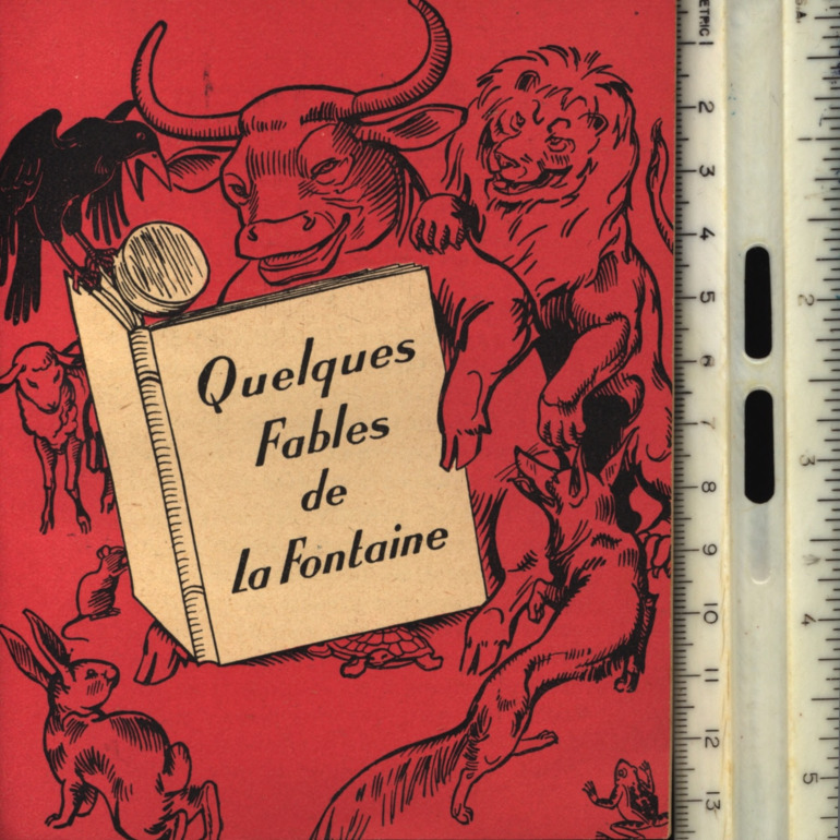 The flaps on the inside of the dust-jacket offer tables of addition, subtraction, multiplication, and division. Both fable illustrations are done with red and green coloring, and offer a rich background to their foreground focus.
