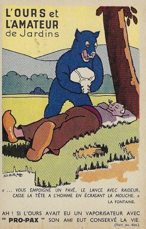 1950? Two postcards advertising Pro-Pax Insecticide. "The Lion and the Gnat" and "The Gardener and the Bear." €9.50 each from Gil Derudet, Saint Cloud, France, through Ebay, April, '22.