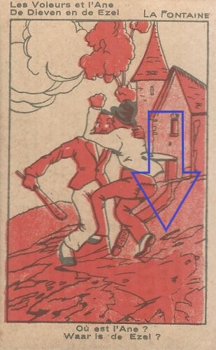 The two stamps picture La Fontaine's home in Chateau-Thierry and a lovely rendition of the frog about to explode before the ox. There is a first day cancellation covering both stamps. Unfortunately the two items are presently pasted to each other. The larger card features BC and a biographical account of La Fontaine.