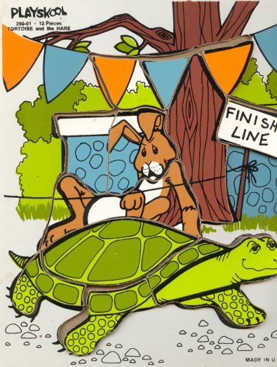 I remember this sort of puzzle fondly from my childhood. A heavy back supports the cut-out outline of the upper level of the puzzle. The large pieces fit right in. This simple puzzle pictures a very happy tortoise! For fun, I offer views of the puzzle both inside its borders and alone. Click on either to see a large contrast of the two.