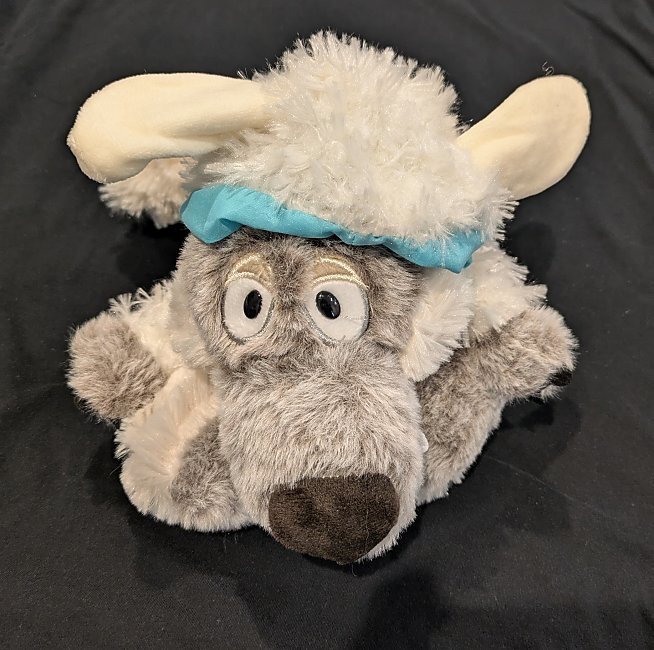 2023? Plush "Wolf in Sheepskin" figure. Total length 12". Polyester fibers. Made in China. $15 from Judaicaman: Joshua Jacobovitz, Shilo, Israel, Jan., '25.