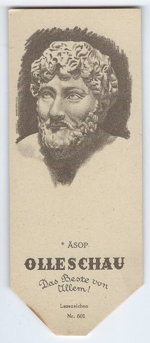 1937? Paper bookmark "Äsop" from Olleschau, "Das Beste von Allem!" Lesezeichen Nr. 601. With verso offering information on his life and work. 5½" x 2¼". €9 from Bartko-Reher, July, '21.