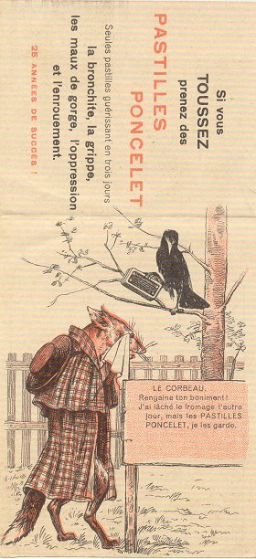 1933 Two handbills of La Fontaine fables illustrated by M. Lemainque: 2P and "Le Gland et la Citrouille." 5⅜" x 7⅜". Printed by Louis Bellenand et Fils, Fontenay-aux-Rises, Advertisement on verso. €2.59 each from la fee chinette through Ebay, Sept., '22.