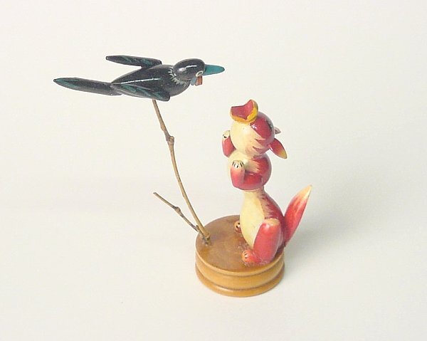 The crow is balanced on a slender twig. He thus moves with any movement of the base, and so he appears ready to drop the cheese as he displays his prowess in singing. Might this little piece be either German or oriental?