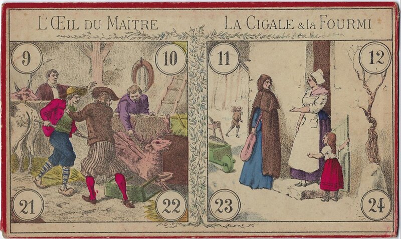 Apparently three of seven sheets that came in a booklet "J'apprends les Fables de La Fontaine en m'amusant" published by Editions Brunier in 1948. About five elements have tabs that one places through slots in the elliptical base to make the fable scene. A text of the fable and instructions for the scene are on the front of each broadside. Lovely coloring! I am not sure that the cardstock is quite firm enough to handle young fingers manipulating the tabs. The nearby farmer in FS and the extra layer for the lion's muzzle are lovely touches! The pages are identical with those in a book "J'apprends les Fables de La Fontaine en m'amusant."