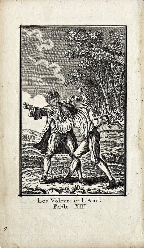 1850? 13 separated pages from a set of (La Fontaine’s?) numbered fables. 4.25” x 7.2”. €50. Unknown source.