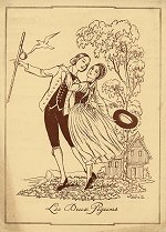Odinot makes Gastrosodine, Sel Digestif Bé-Me-Cé, Pluribiase, and Néo Cal-Ci-Line. Except for information like this and Gutenberg's identification, the back of each page is empty. The illustration on the front is a pen-and-ink drawing including always a pretty girl. I supposed this is a sophisticated version of the "French post card." The identifying features for the girl seem to be a swishing skirt and a low-cut blouse. She is the lamb stalked by the wolf, the reed that can bend. She, with a tear on her cheek, keeps his hat away from the fellow pigeon who wants to wander. She is apparently why the shepherd does not go off on a ship. She drops grapes down to the fox below, who has lost his shoe trying to climb the tree after her. In the most surprising turn for me, the old man planting the tree is assisted by the prettiest water-can-holding-assistant that one could imagine. Good fun for people who know the fables so well that they can enjoy parodies of them.