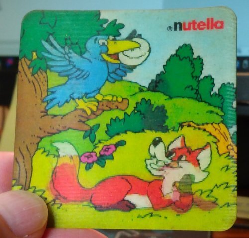 1980? Two each of two Nutella "visiomatic" coasters presenting one of La Fontaine's fables, specifically TH and FC. 1½" square. €15.80 for the group of four from eugtara-20 on Ebay, Feb., '23.