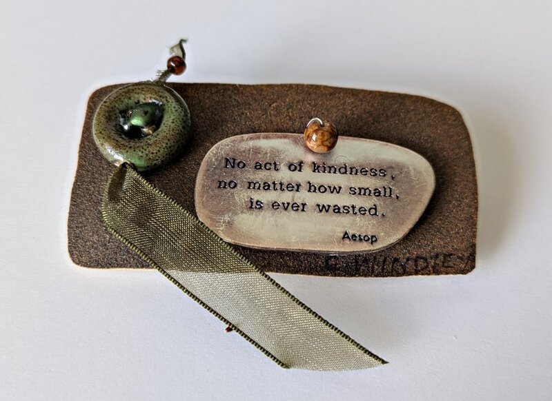 2010? Brooch. "No act of kindness, no matter how small is ever wasted. Aesop." C. Windle? Composite of various materials, including metal inscription. Signed by C. Windle? Unknown source.
