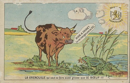 Here the bull responds, apparently as the frog tries to blow herself up larger, "It's no use! You don't eat SEL." It appears that this advertisement card, signed by the artist, is pre-stamped. That artist's name is difficult to decipher. I could not find that artist on the web. "Sel" alone is salt. I have wondered if this is not rather a product name, but that product would have been known a hundred years ago, and I cannot find reference to it on the web.