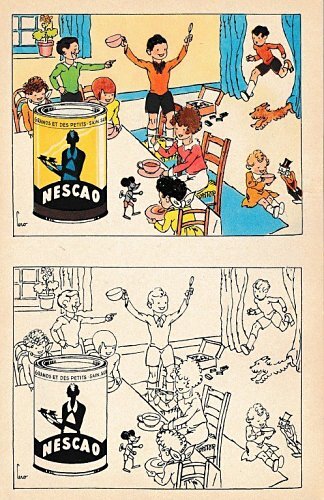 Young René has developed a pattern. He works poorly all year long, but then races through his work at the end. One day he pays for this fault. His classmates have all been invited to a cup of Nescao with buttered bread. René, sure that he can get there quickly, arrives late. Every drop of that delicious Nescao has been consumed! In the picture we see René just entering through the drapes at the upper right. The other children are not only enjoying the Nescao; they have also found the "vignettes," stickers to put into their Nestle albums, so that they can get 50 Francs for completing an album – and have a chance besides at a ticket in the National Lottery!