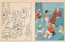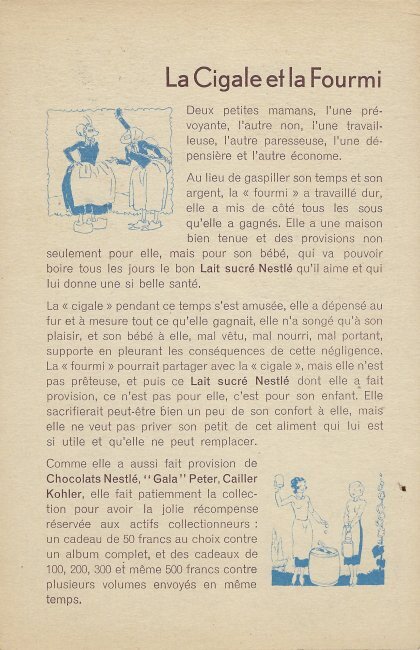 1940? Six large cards (8¼" x 5¼") presenting a colored scene and its black-lined outline to color in. Nestlé. The verso applies the fable presented in the human application in the illustration. $60 from Bertrand Cocq, Calonne Ricouart, France, Sept., '18. GA for €9.99 from Lisi47 through Ebay, Sept., '21.
