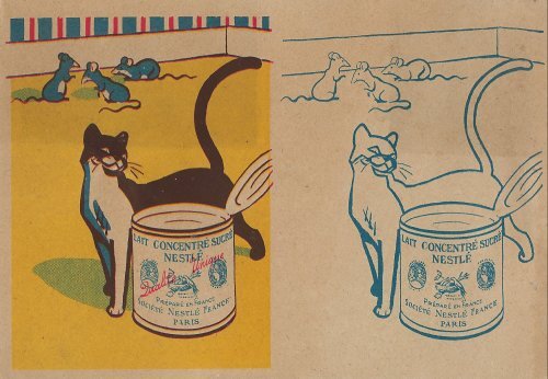 1930? Seven Nestlé advertising cards. Text and illustration on the front side of each card in duochrome black and blue. The verso of each, in black and one other color, has questions, suggestions, and a mention of Nestlé.