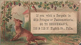 This card's picture echoes that of another by Universal Advertising Company advertising their Aesop's Fable Cards, including six designs. The date of the program anchors the production of these cards in the early 1880's.