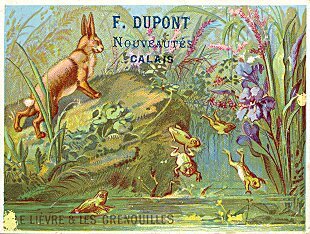 1895? 2 full-color landscape-formatted cards illustrating the La Fontaine fables "Le Lièvre et les Grenouilles" and WL. 3" x 4 1/8". Both display large block-print fable titles on the picture side. The former advertises F. Dupont in Calais and is marked "Lith. Van Seleyn (?)" with an indecipherable Paris address. $10 for the pair from Bertrand Cocq, Calonne-Ricouart, France, March, '01. TMCM for €5 from Simon Rodrigues, June, '22, along with an extra of "The Hare and the Frogs."