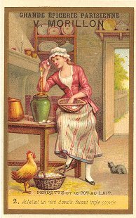 1891? Perrette et le Pot au Lait. Grande Épicerie Parisienne V. Morillon. Three numbered cards, each with a section of La Fontaine's text under the illustration. Publishers: Paris: Imp. Romanet et Cie. 3 Euros at Clignancourt, June, '07.