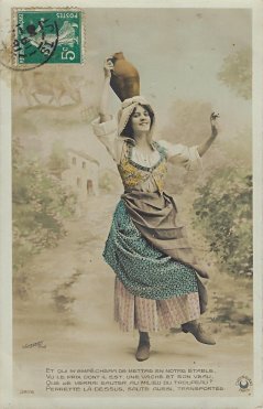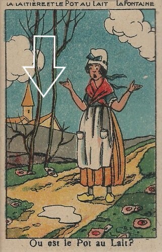 1911 La Laitiere et le Pot au Lait: Fable de La Fontaine. Colored series of 5 portrait postcards photographed by Sazerac and published by Croissant. 3 cards for €10 from Cpaphil, Saint-Fargeau, France, August, '13. Two additional cards in the series (#4 and #5) from Bertrand Cocq, along with duplicates of #1 and #3, for $6 each, Sept., '20. Extras of Cards #2 and #3 for €1.30 each from for collecman through Ebay, Jan., '23.