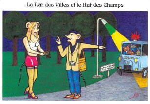 These cards exhibit lively artistry. They are marked by a common orthography in presenting the fable title on the image side and a common format on the message side. Montmorillon is known as a book town and describes itself on the message side of the cards as "Cité de l'Écrit et des Métiers du Livre." One of the liveliest cards, UP by Claude Coudray, is the title card for a set of black-and-white cards found earlier from the wife of the artist at a card fair in Paris in Jan., '05. "The Pig, Goat and Lamb" (#37) by André le Guilloux I had also found as part of a group purchased from the artist at the same card fair. I list it both here and there. This show was a wonderful outpouring of imagination directed to La Fontaine's fables! Among the highlights of this group, I point to FS (#7), for which both animals have their heads buried in menus! In "Fox and Goat" (#11), both animals wait for service from a waiter bringing bear and food! In #18, the horse uses a cart to carry the ass and his load.