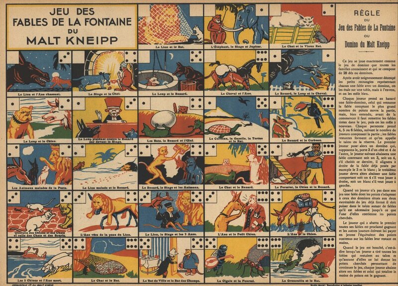 This light cardboard piece could have appeared here under "Advertisements," "Printed Material," or "Games." I chose the last of the three. The sheet includes instructions to cut out the 28 dominos, each of which pictures a well-known La Fontaine fable. The seller guessed a printing date between 1928 and 1940. It is curious that "Kneipp" is spelled with two p's at the end at the top of both parts of this sheet. The printer, however, is "Malt Kneip."