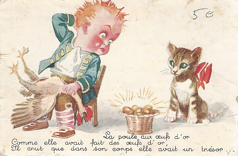 Another strong effort by Mauzan. When Mauzan turns to humans, he uses children. Here the red-faced killer of the hen seems more amazed at the collection of the golden eggs than at the empty dead chicken in his lap.