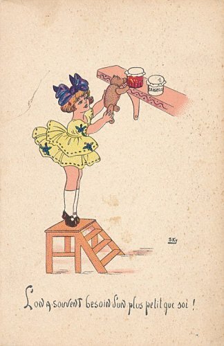 1913? Fructine-Vichy postcard featuring a girl on a ladder using her toy to reach jam on the shelf. LM: "On a souvent besoin d'un plus petit que soi." SKy. $8 from Bertrand Cocq, Calonne Ricouart, France, Sept., '18. Second copy for $6 from Bertrand Cocq, Calonne Ricouart, France, Sept., '20.