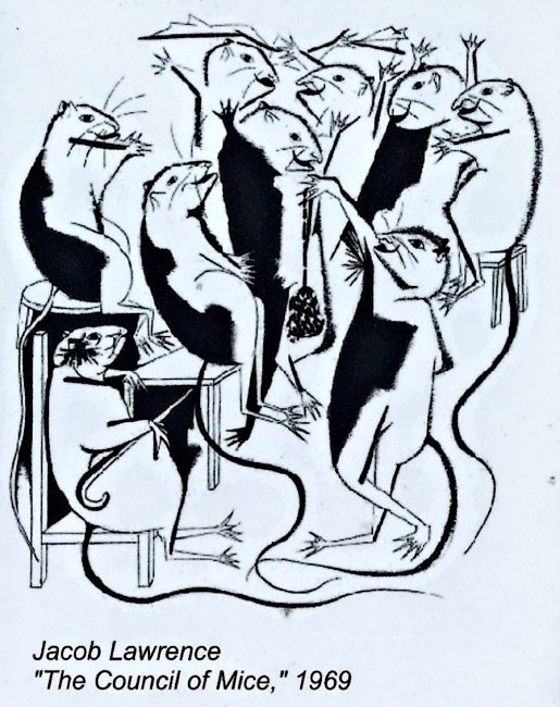Here may be a first: As I tried to research this item online, what I found immediately was our own Archives' reference to it on the web. "A rectangular magnet with a black and white image printed on it. The image printed depicts a group of mice enthusiastically talking to one another. Under the image depicted there are words that read: "Jacob Lawrence 'The Council of Mice,' 1969." I would add a comment or two. Notice the older mouse with an umbrella in the lower left. He is the one who will "call the question," a question that will find no one volunteering. I suspected that this was an Etsy product, but extensive searching has not come up with a clue, there or elsewhere.