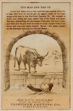 "The Man and the Ox" has a man fallen into a well hoist himself up and out on the horns of an ox who happens to be on his way to the Fairbank Canning Company!