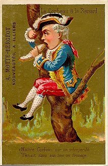 These are curious cards. The background is heavily gold with a few emblematic items, like a path and a few trees. The characters are all children highly dressed in adult clothing. Their faces form the focal point of each illustration. A particular curiosity of these portrait-formatted small cards is that the characters' clothing changes from card to card in the six moments of the story. Are we to think that a little troop of players are taking turns at acting out one scene each? The bottom portion of each picture page contains a few lines of the La Fontaine fable. This print, like the title at the card's top, is hard to read against the gold background. Each card in the Cocq set is stamped on the picture side with "A. Motte-Bergeot, Nouveautées a Illiers," which seems to sell furniture as well as men's, women's, and children's clothing. The text side of these cards is taken up completely with a uniform advertisement for Motte-Bergeot. I am especially impressed with the third card, on which "Renard" flatters the vain figure seated in the fork of the tree.
