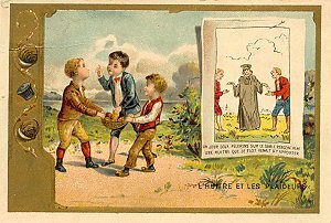 1900 Fables de La Fontaine. Veritable Extrait de Viande Liebig. Six cards, each with an animal scene from a fable of La Fontaine attached with a stick-pin to a human scene of children. Publishers: Liebig Company, Paris. £27.50 from Murray Cards International, Cecil Court, London, April, '06. Extra set in excellent condition for $37.20 from James Longworth, Apopka, FL, through bidstart, August, '11.