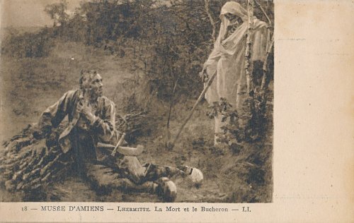 1910? (Léon Augustin) Lhermitte, "Death and the Woodman." Black-and-white photograph of "La Mort et le Bucheron." Musée d'Amiens. #18. "L.L." Paris: Levy and Neurdein Réunis. $8 from Bertrand Cocq, Calonne Ricouart, France, Sept., '18.