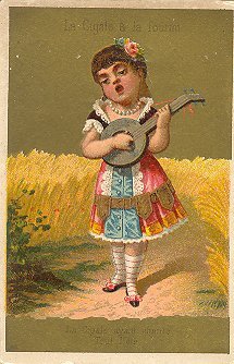 These are curious cards. The background is heavily gold with sparse suggestive scenery, especially ripe fields, storehouse doors, and snow on the ground. The characters are children dressed in adult clothing. Their faces form the focal point of each illustration. A particular curiosity of these portrait-formatted small cards is that the characters seem to change clothing (and faces?) from scene to scene in the five moments of the story pictured here. Are we to think that a little troop of players are taking turns at acting out one scene each? The bottom portion of each picture page contains a few lines of the La Fontaine fable. They give the clue to the order of cards, which is difficult to decipher from the pictures alone. The print of these texts, like the titles at the cards' top, is hard to read against the gold background. The text side of four cards is taken up completely with a uniform advertisement: "Grand Magasins de Nouveautés/Au Progrès/Vallée Ainé" with an address in Caen. The verso of other cards is blank. Perhaps the best of the illustrations is the fourth, in which the niggardly ant asks what the cicada did during the summer.