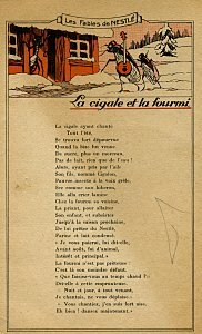 Under the series title of each card front is a simple duochrome picture illustrating the fable. Beneath that and completing the space within a framed rectangle is La Fontaine's text. Each verso occurs twice among these six cards: an advertisement for album-vignettes, ideas on how to use Nestlé products, and advertisement of further Nestlé products. Fables presented include GA; "The Rat and the Elephant"; "The Cat and the "; FS; TMCM; and FC. The paper is cheaper than most card stock. I cannot find an author for "The Cat and the Green Woodpeckers," which seems to close with a humorous quotation from La Fontaine. Is a fox here saying of some young woodpeckers that they are "too green"?
