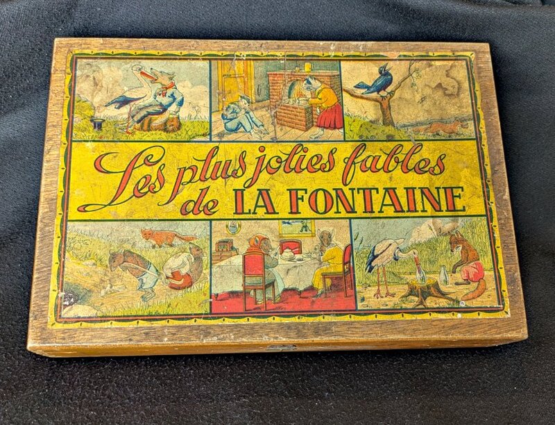 I agree with the seller’s description: “Superbe et rare jeu très ancien de 24 cubes en bois, dans sa boite d'origine." This is a beautiful set! The six fables are pictured on the wooden cover 10.75” x 7.5”. They are WC; “The Cat and the Monkey”; FC; “Two Rats and an Egg”; TMCM; and FS. It was not easy for me to put these together! The seller stipulates France as the origin; I wonder if the set might not come from Germany. I did a quick Google search, which turned up one instance of this set, which turned out to be our set offered for sale through another exchange.