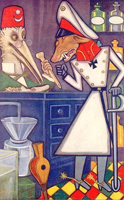 D1. "The Wolf and the Stork." In this parody of WC, A wolf dressed in a German officer's great coat with spurs and sword menaces a Turkish stork, who holds a bone in his hand. The card's own explanation is "It seems that Turkey, and the other friends of Germany, have to be content with very little gratitude for the help they have given." Series title: "Aesop's Fables Up to Date." $11.17 as part of a complete set from Susan Brouwer, Hesperia, CA, through Ebay, July, '00. Extra exemplars for $11.25 from Carolyn Nimmer Dias through Ebay, March, '99, for $25 from Dick Lightle, April, '00, and for $4 from Betty Jette, Epsom, NH, through Ebay, July, '99.