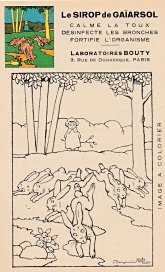 1920? Two crayon-colored cards advertising "Le Sirop de Gaïarsol." FS and WL. Illustrated by Benjamin Rabier. "Image a colorier." Laboratoires Bouty, Paris. €4 each at St. Ouen, August, '15. And nineteen uncolored trade cards from Le Sirop de Gaïarsol, a product of Laboratoires Bouty, Paris. A larger black-and-white image by Benjamin Rabier and a colored small image as model. One duplicate: "Bird and Rabbit." $90 from Bertrand Cocq, Calonne Ricouart, France, Sept., '18.