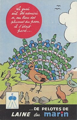 1935? Laines du Marin ("Sailor Wool"). Complete set of twelve colored postcards using La Fontaine's fables to advertise this brand of wool. $100 from Bertrand Cocq, Calonne Ricouart, France, Sept., '20. Duplicate of TH for €5 from Akpool, Berlin, June, '20.