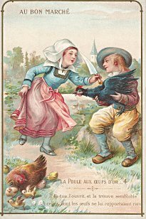 In the first image, a little girl seems to be putting coins into a stocking while a little boy watches. This seems the "before" of the story itself, establishing that the couple is poor. The second scene shows the young man delighted to have found a golden egg. The young man believes in the third scene that this black hen contains a whole treasure. The fourth card introduces the sinister knife with wondrous eagerness! In the fifth scene, the hen lies dead and the two humans grieve. Now in 2020, I have learned from Bertrand Cocq that there are actually six cards in the series. Of course! There are always six! Lovely colors!