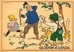 1947? La Fontaine's Fables in children's scenes. 18 cards produced by M. Barré and J. Doyez, Paris. The artist's signature seems to be "Lack" or "Jack." Series 1426; each card has a different letter following that number. No. 614. The fable is printed in script on the message side of the post card. At about the same time, this publishing firm did a series of colored postcards by Starling. Imprimé en France. 30 Francs each from Normand Antiquités at the Marché aux Puces, Clignancourt, May, '97 and July, '98. 45 Francs each for eleven cards from M. d'Autreppe at Clignancourt, August, '99. Fourteen more cards for €4 each, St. Ouen, August, '17. Persistence has paid off: I now have what I believe are the last two cards ("D" and "H") for $12 from Bertrand Cocq, Calonne Ricouart, France, Sept., '18.