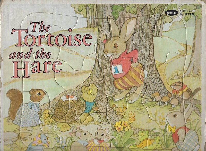 1972? Jaymar Tortoise and Hare Puzzle. Ages 4-6. 12 pieces. Copyright Drawing Board Greeting Cards. Jaymar Specialty Company, Brooklyn, NY. $11.99 from glass-eye-industries through Ebay, May, '19.