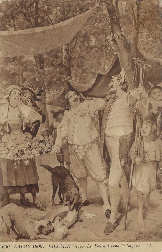 1909? One photographic postcard presenting “The Fool Who Sells Wisdom.” “600 SALON 1909. JACOMIN (A.) -- Le Fou qui vend la sagesse.- LL.” $8 from Bertrand Cocq, Calonne-Ricouart, France, Sept., ‘’20.