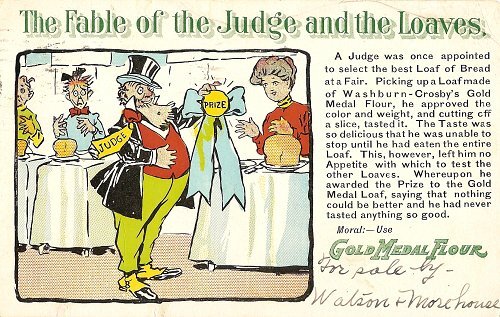 1906? "The Fable of the Judge and the Loaves." Gold Medal Flour advertising postcard. Sent to Mrs. H. Smith, Kent, Conn. and postmarked 1906 in Minneapolis. $5 from Andover, MA, through eBay, March, '08.