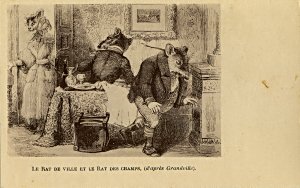 1898? Ten monochrome landscape La Fontaine fable postcards, each labeled "d'apres Grandville." Duplicates of GA and "Rat Who Retired." $143.95 from Portugalcards - Jose Monteiro, Lisbon, Feb., '10. Extra copy of FS with a message, apparently postmarked in 1908. 50 Francs from Annick tilly, Clignancourt, July, '01.