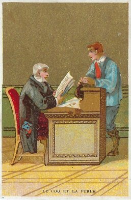 1890? 8 colored French cards, with golden background and block letters, picturing scenes from La Fontaine's fables. 2½" x 3¾". No printer acknowledged. €14 for the set from Albert van den Bosch, Antwerp, June, '23.