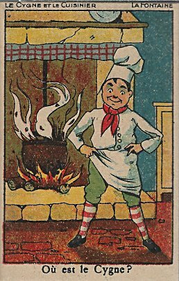 These illustrations--lively, colorful, and contemporary--are taken from the Exposition "Quand la Fontaine rime avec le rock." "Les Deux Mulets" is postmarked in 1996, while the other two are postmarked two years later. The former card shows one mule driving a tractor in front of another mule dapperly clad as a chauffeur in a large vehicle. FS has a sporty stork sitting across from a primitive fox with sunglasses on his forehead. The fish-laden beakers are transparent. The monkey in "Le Singe et le Dauphin" looks like a jockey, and the dolphin looks as though he is having a great time! I would love to see more of Gedge's work in this style. The only reference I could find on the web speaks of the exhibit this way: "Les saveurs de La Fontaine remises au goût du jour, mijotées sur les fourneaux de l' illustrateur Gedge et assaisonnées avec quelques épices de Rock and Roll."