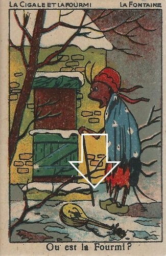 1900? "La Cigale et la Fourmi." Complete five card numbered postcard set. From various publishers. $35 from Bertrand Cocq, Calonne-Ricouart, France, Sept., '20.