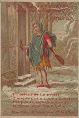 1910? Set of five GA trade cards. Two multi-colored cards featuring a young woman as the cicada in the cold and then knocking at the ant's door. Four verses of La Fontaine's fable are on the image side of each card. Earlier: "Au Gagne Petit." The second card is from C. Remontey in Paris and was printed by Clamaron. €5 in St. Ouen, June, '19. Cards #1 and #4 for €15 each from Albert van den Bosch, Jan., '23. Card 3 for €15 from Albert van den Bosch, Antwerp, June, '23. Four further cards, including one advertising Maison du Pauvre Diable, for €2 from marcel2795 on Ebay, August, '23.