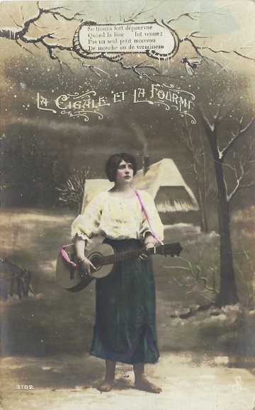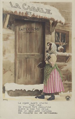 This set is unusual for including ten cards rather than the usual six. It has every scene working from the same stage, and that arrangement may violate the fable for the cicada's summer singing, which here needs to be before the ant's window. Where did the ant get that fancy headdress? The ninth card looks as though the ant may be inviting the cicada into her protection in her cape. For me, the final scene is pictorially not clear. I believe that we are seeing the back of the ant as she walks away, rejecting the cicada and leaving her to the onslaughts of winter. The versos of all ten cards are blank. As so often, in French presentations of this fable, we see the cicada as a lovely young barefoot woman with a guitar.